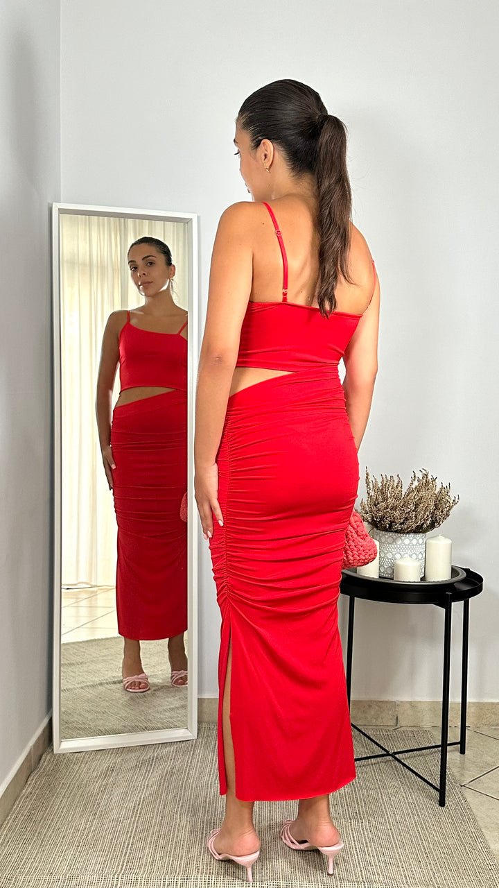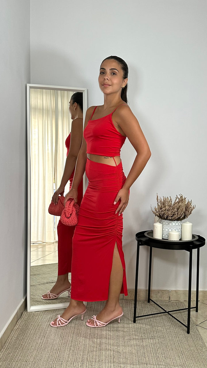 La gonna scende lunga fino alla caviglia. Il suo design è impreziosito da una arricciatura strategica su un lato, che dona volume e movimento. Questo dettaglio non solo valorizza la figura, ma nasconde anche uno spacco laterale, che si rivela con il movimento, aggiungendo un tocco di audacia e facilitando la camminata.