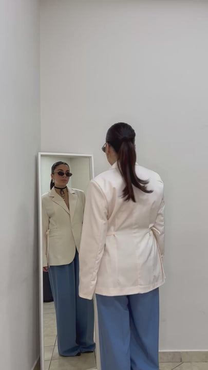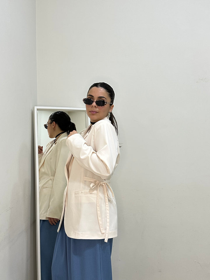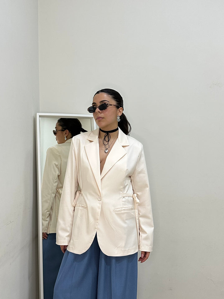 Blazer dal taglio classico,chiusura frontale con bottone singolo.lacci laterali per stringere e definire la silhouette in vita.