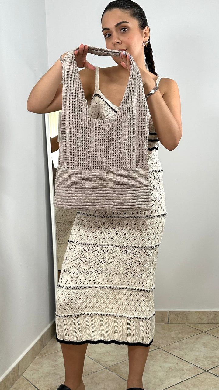 Questa borsa presenta un design in maglia in un colore neutro chiaro, il che la rende versatile e facile da abbinare.