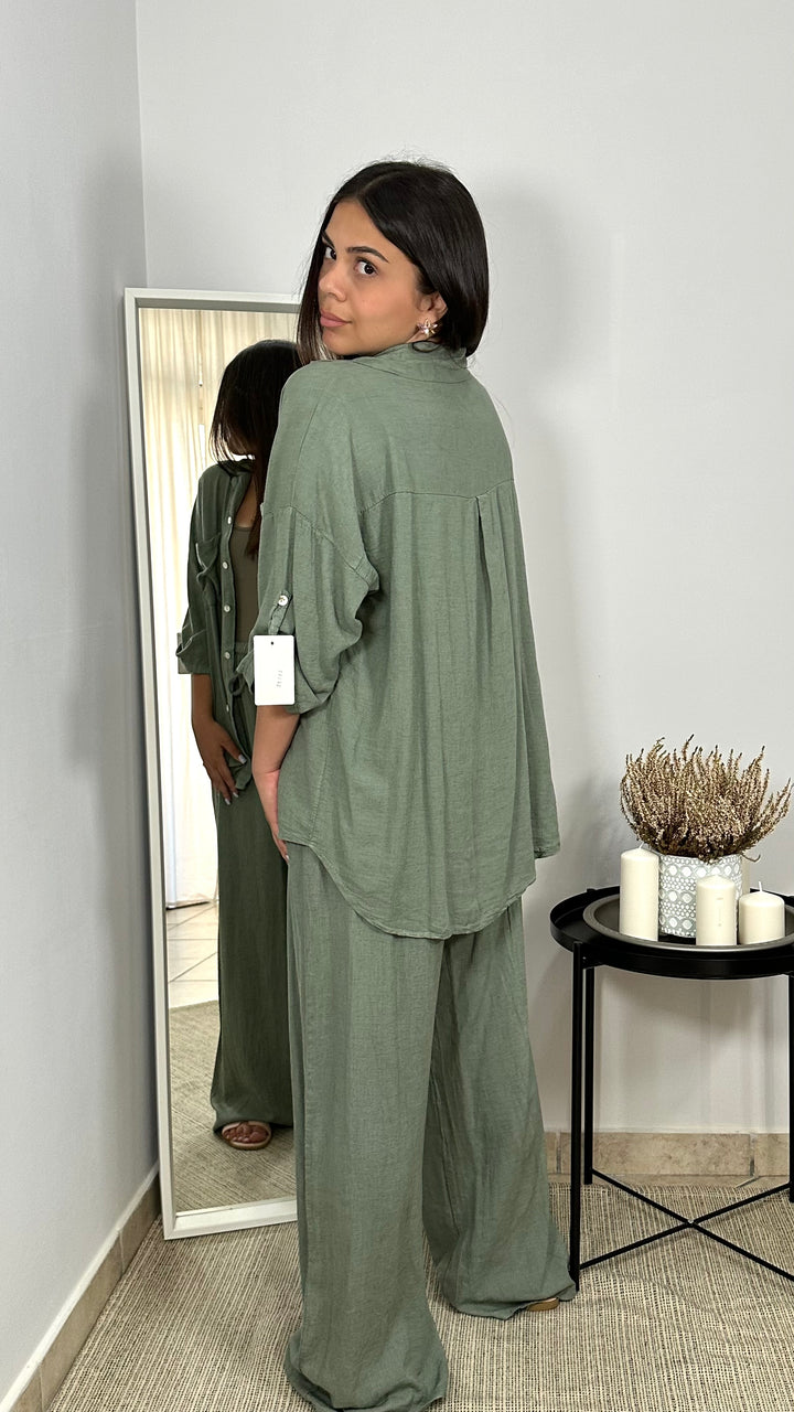 Realizzato in un tessuto misto lino, questo coordinato offre un look rilassato ma sofisticato, ideale per ogni occasione, dalla giornata in città al relax in vacanza.