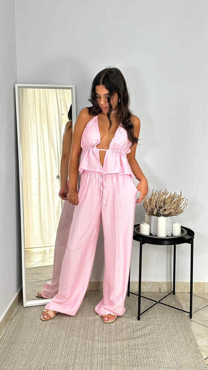 Il top presenta un design halter neck che mette in risalto le spalle e il collo. Il profondo scollo a V, impreziosito da un laccetto sottile che può essere annodato al collo, aggiunge un elemento sensuale ma raffinato.