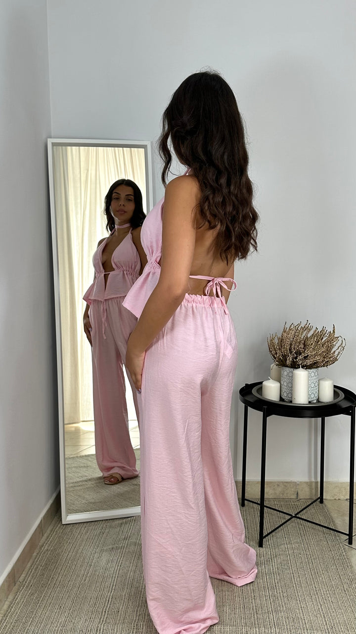 La parte inferiore del top scende morbida con un leggero effetto peplum, creando una silhouette armoniosa e femminile. La schiena è completamente scoperta, legata da un fiocco regolabile che permette una vestibilità personalizzata.