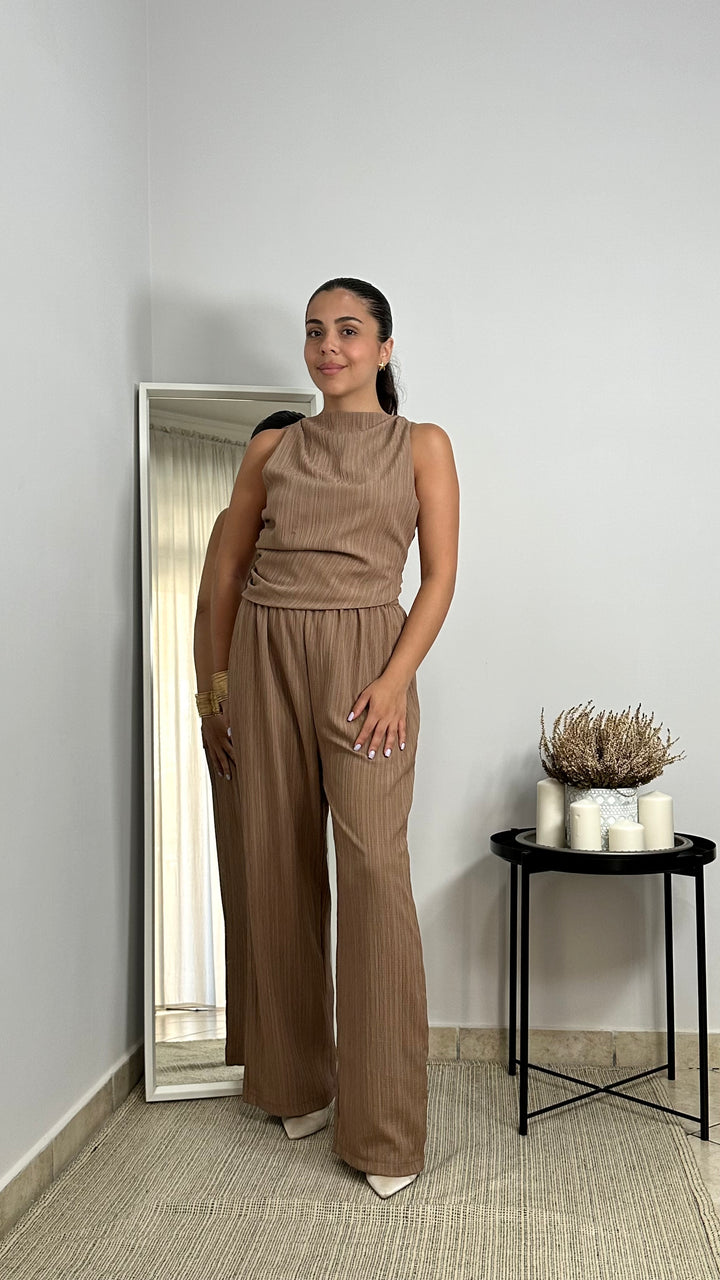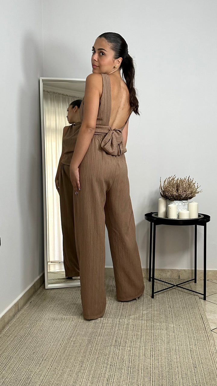 Coordinato color cammello il top ha un taglio dritto è semplice sul davanti,mentre la schiena è caratterizzata da una profonda scollatura V che si chiude con un elegante fiocco in vita,aggiungendo un tocco di raffinatezza.il tessuto leggero presenta una delicata texture a coste verticali.Abbinato a pantaloni ampi e fluidi.