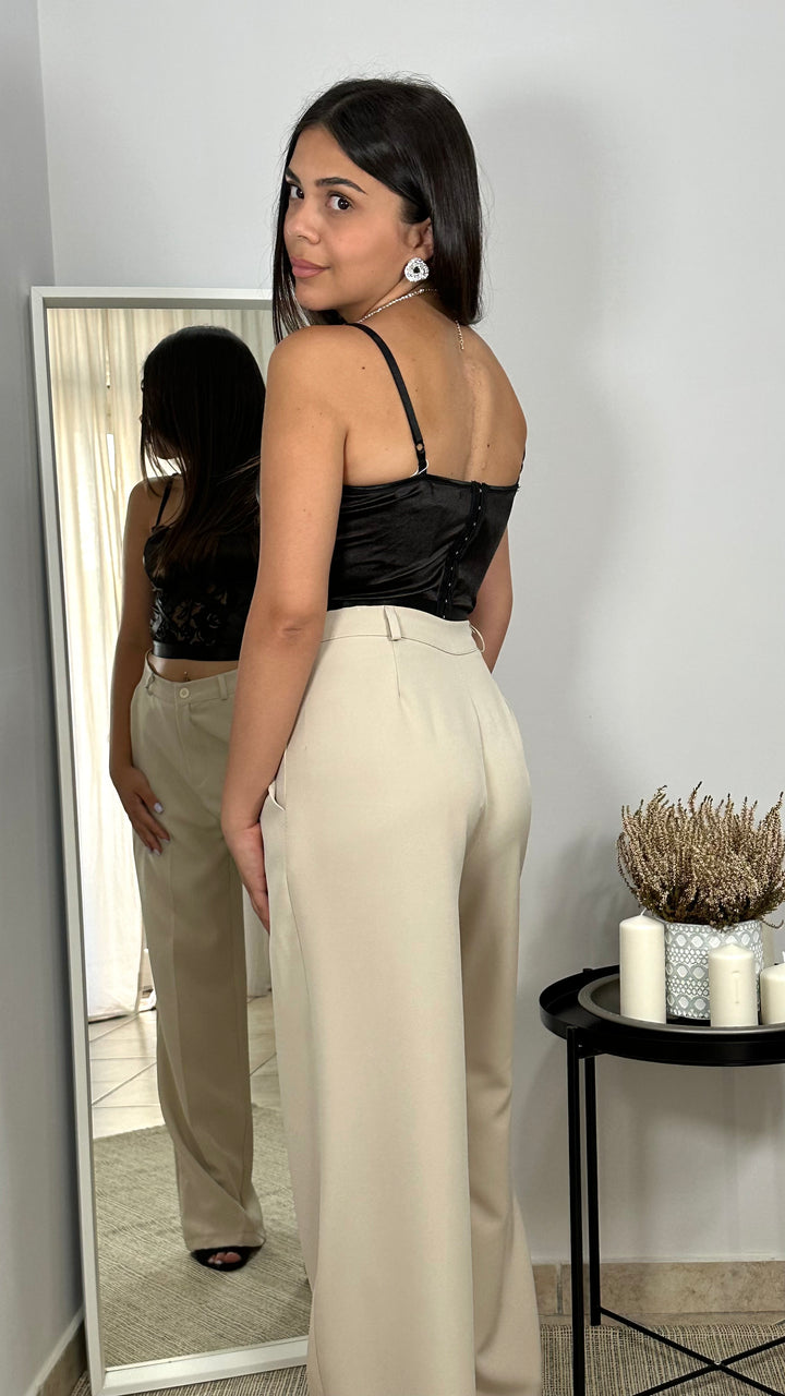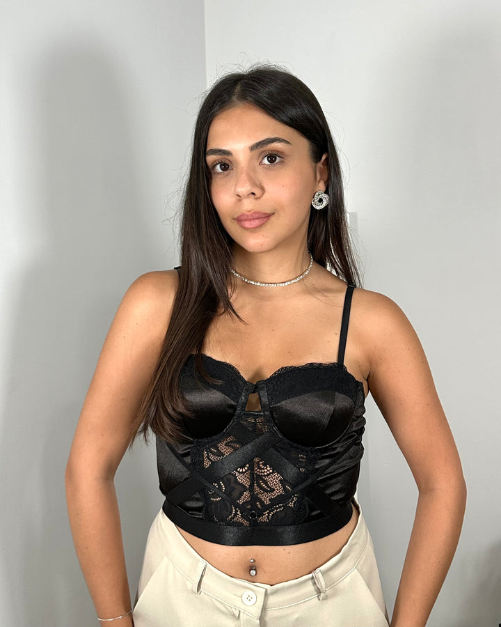 Realizzato in un tessuto satin con dettagli in pizzo nero e un incrocio sul davanti. Le coppe del reggiseno sono leggermente push-up per offrire supporto e modellare il seno, con un delicato bordo in pizzo che ne esalta la forma.