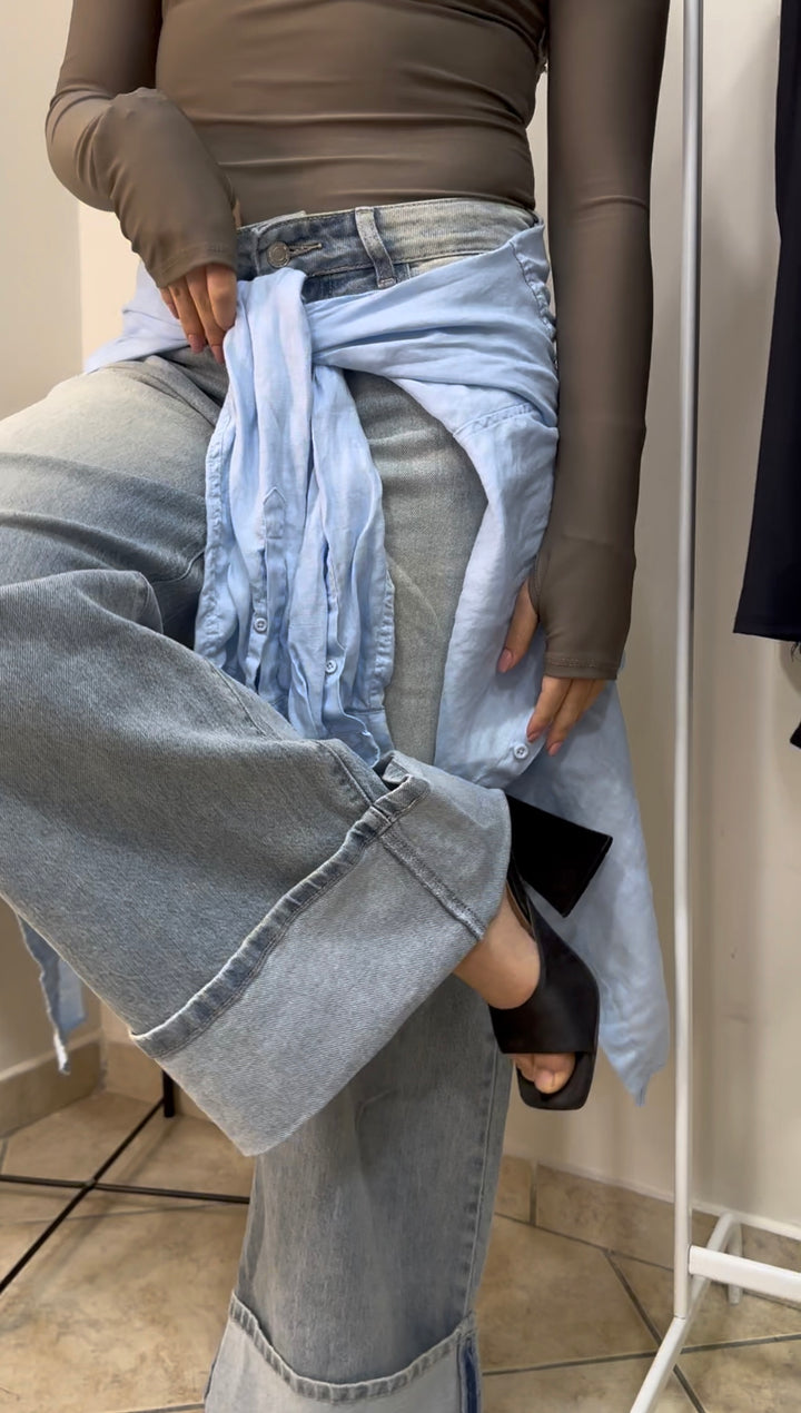 La particolarità di questo modello è il maxi risvolto fisso sul fondo, che aggiunge un elemento di design audace.