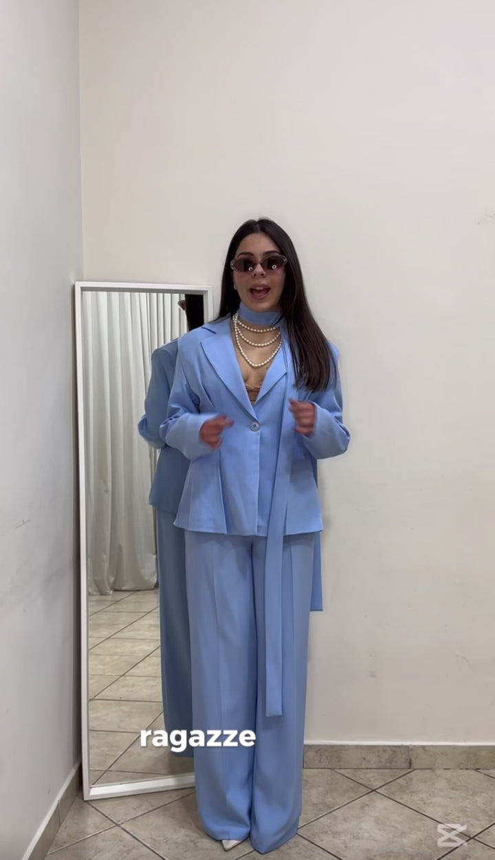 Tailleur tg unica ,il pantalone presenta tasche laterali ed elastico sul retro,avanti chiusura con zip e bottone,giacca bottone spalline imbottite,strett sul punto vita per un fit pazzesco.La fusciacca indossata sia in vita che collo.