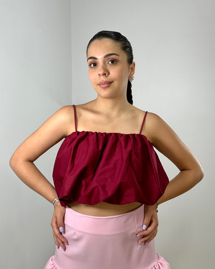 Realizzato in un tessuto bordeaux, presenta un design a balze voluminoso che crea una silhouette sofisticata. Le delicate spalline sottili aggiungono un tocco di eleganza e femminilità, rendendolo perfetto per essere indossato da solo o a strati. La vestibilità crop esalta la vita, abbinandosi a gonne a vita alta, pantaloni o shorts. Ideale per un look casual chic di giorno o per un'uscita serale.