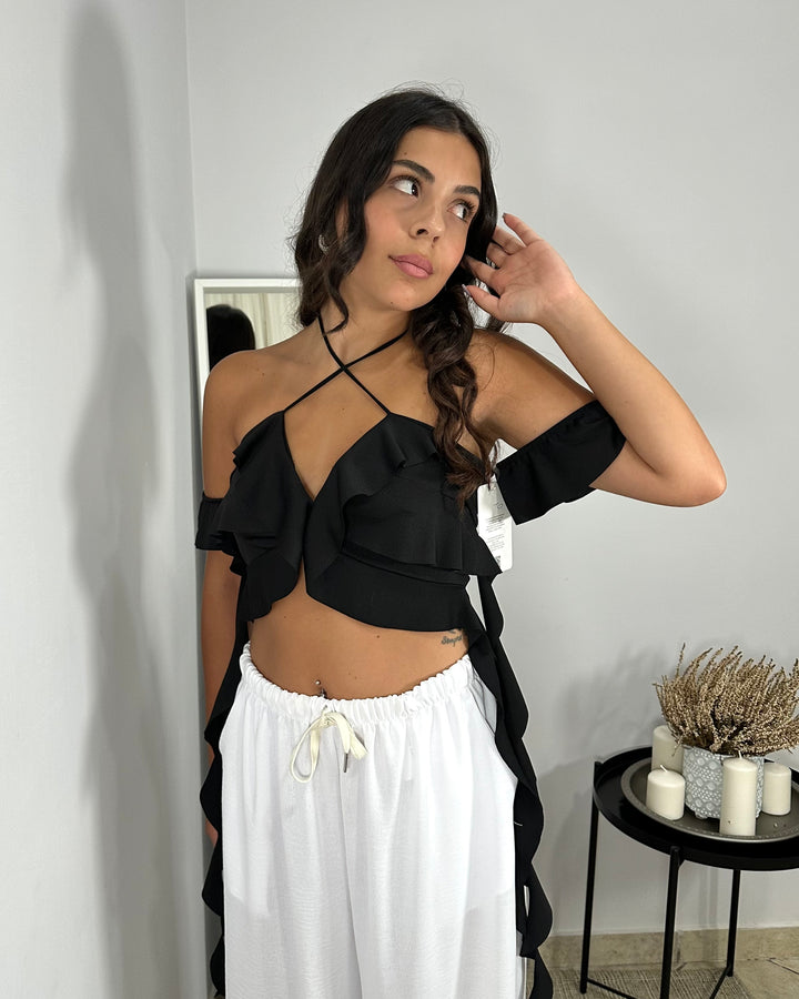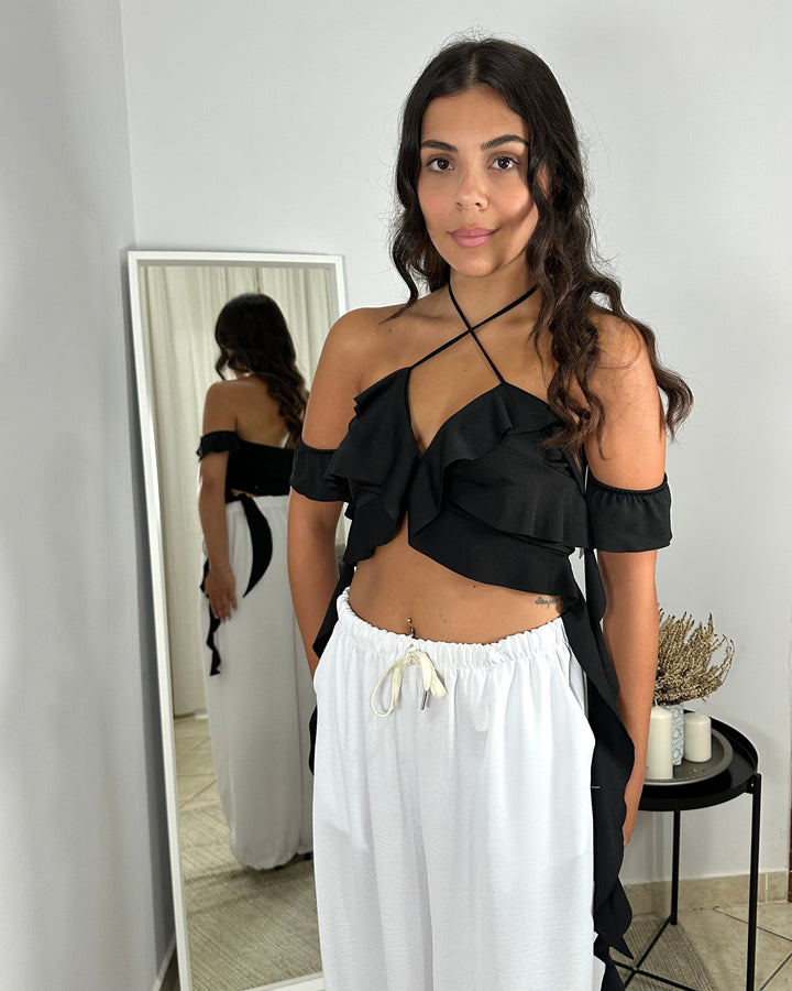 Il design presenta uno scollo a V profondo, accentuato da un dettaglio incrociato sul davanti che aggiunge struttura e un tocco intrigante. Le spalline sottili incrociate dietro il collo si fondono con un'apertura sulle spalle. Le maniche corte, anch'esse con un leggero volant, cadono elegantemente sulle braccia.