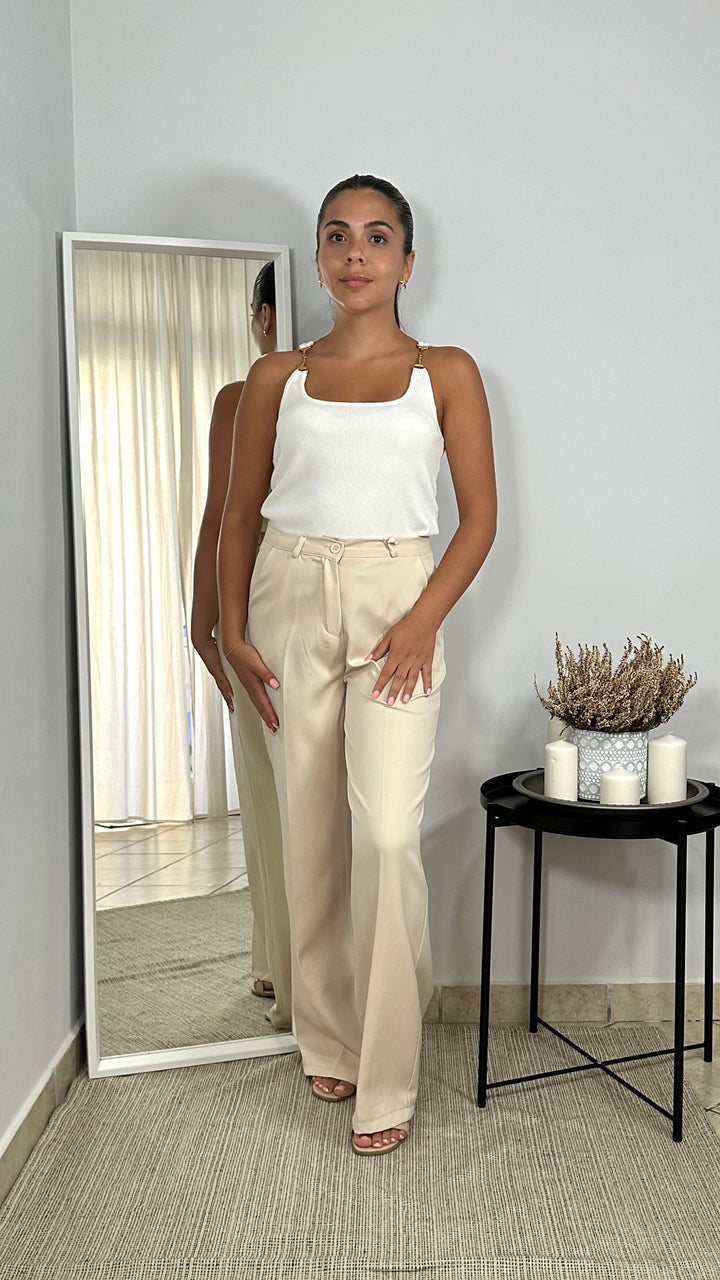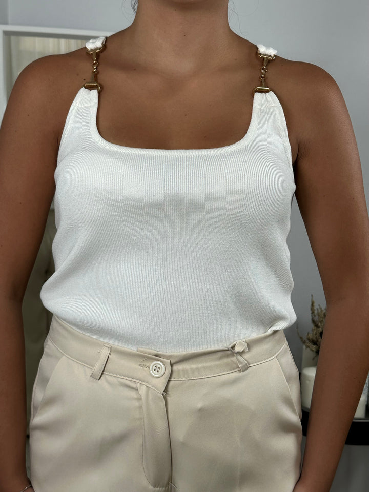 Il design è impreziosito da spalline gioiello: spesse, sagomate e arricciate, con inserti metallici color oro che aggiungono un tocco di lusso e originalità. Lo scollo quadrato profondo sul davanti e sul dietro dona un'eleganza moderna e mette in risalto il décolleté e la schiena con discrezione.
