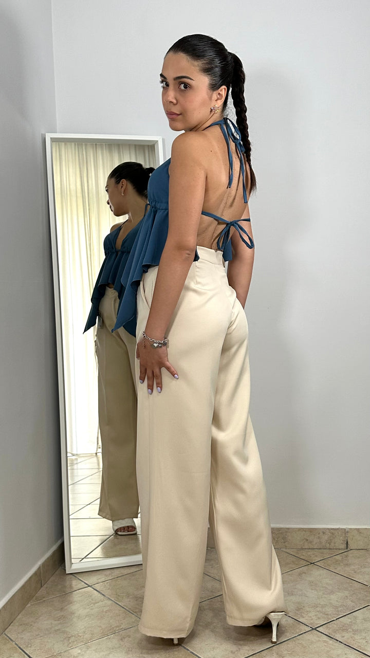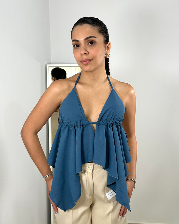 Questo top halter in una tonalità di blu petrolio è un capo distintivo che unisce leggerezza e stile.